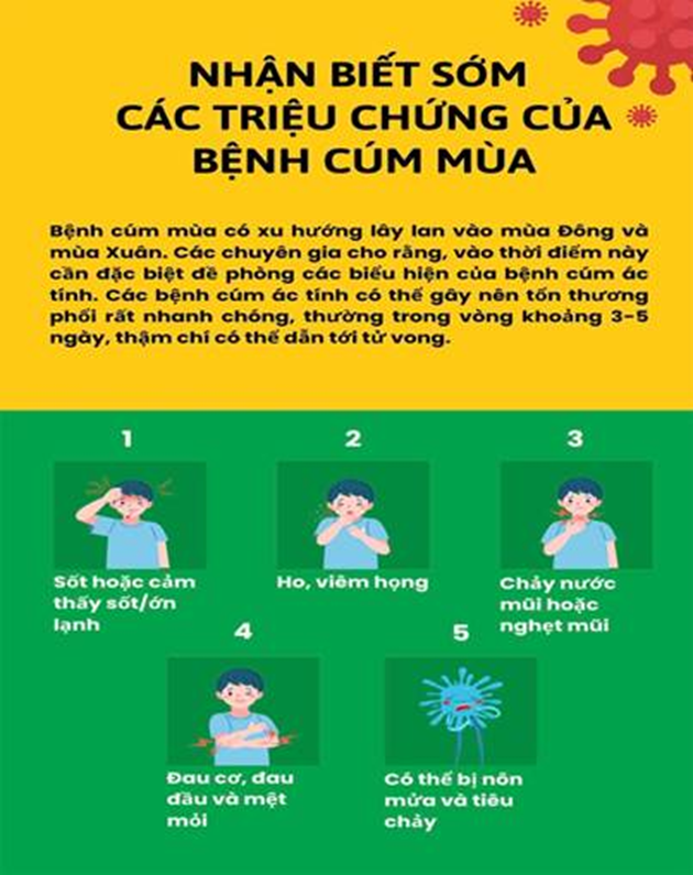 Thời điểm giao mùa, thời tiết thay đổi thất thường khiến virus cúm dễ lây lan. Các triệu chứng cảm cúm như ho, sốt, đau họng, mệt mỏi có thể ảnh hưởng lớn đến sức khỏe – đặc biệt ở người cao tuổi, trẻ nhỏ, phụ nữ mang thai và người mắc bệnh mạn tính. * Tiêm vắc xin phòng cúm là biện pháp chủ động, an toàn và hiệu quả giúp: - Tăng cường miễn dịch, an tâm làm việc, học tập - Giảm nguy cơ mắc cúm và biến chứng nặng - Bảo vệ bản thân, gia đình và cộng đồng Hãy tiêm vắc xin phòng cúm ngay hôm nay để bảo vệ sức khỏe của bạn và gia đình!